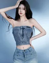 牛仔面料,天生带着率性、街头与年轻的基因。而抹胸与短裙的剪裁,则打破了牛仔固有的中性印象,勾勒出柔美的肩颈线与腿部线条。这种搭配本身即是一种冲突美学——硬朗材质与柔软身段的对比,随意风格与精致性感的并存,奠定了“纯”与“欲”交织的基调。模特无需刻意摆弄姿态,仅是静静地站立或倚靠,那份青春的活力和内敛的诱惑便呼之欲出。