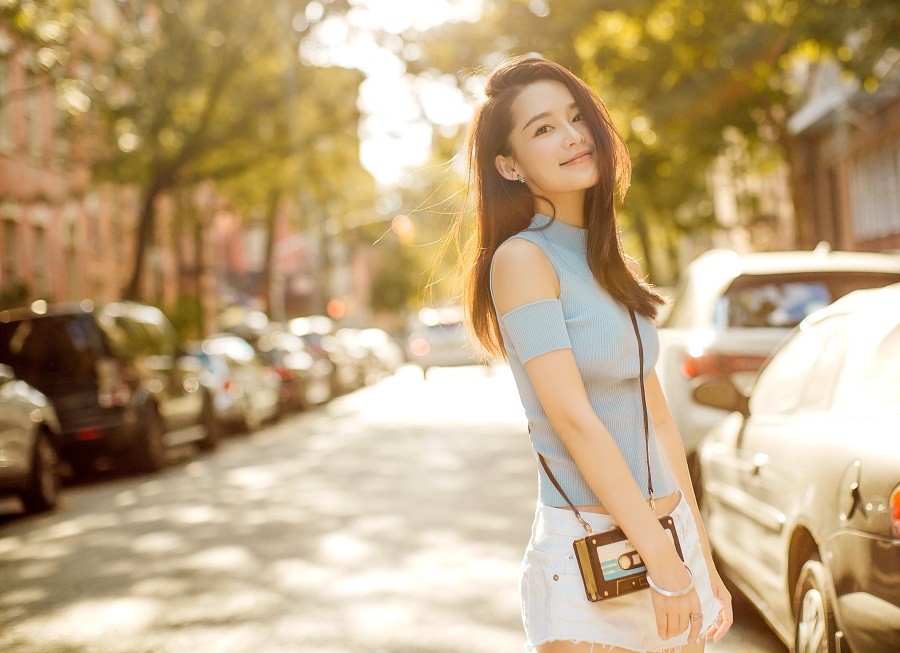 李沁倚靠街边栏杆,雾霾蓝针织衫衬得肌肤白皙,气质恬静